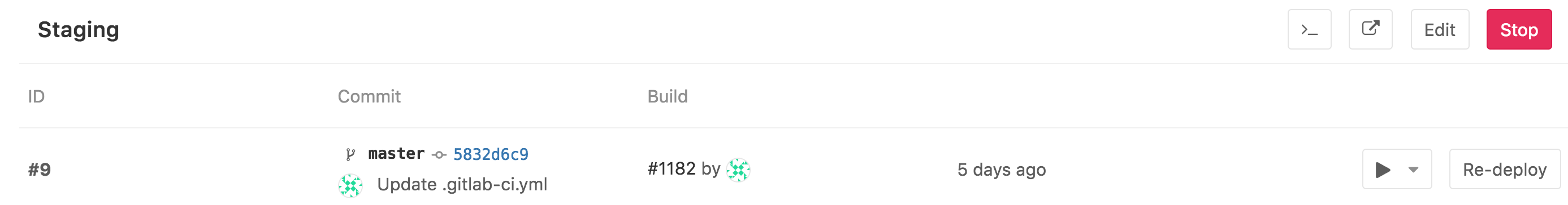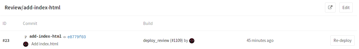 • A button that re-deploys the latest deployment, meaning it runs the job defined by the environment name for that specific commit