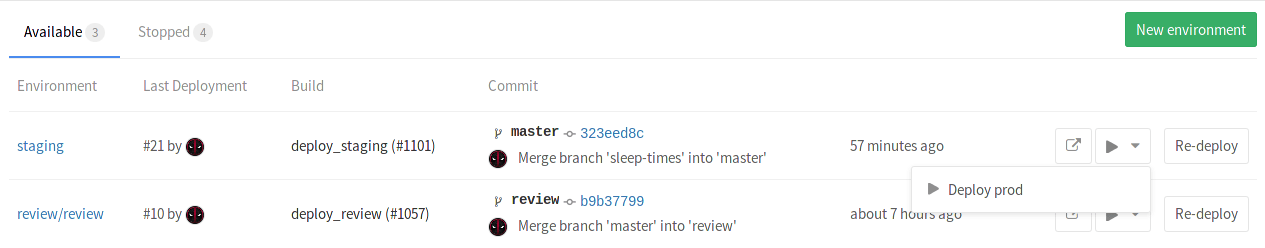 Clicking on the play button in either of these places will trigger the deploy_prod job, and the deployment will be recorded under a new environment named production.