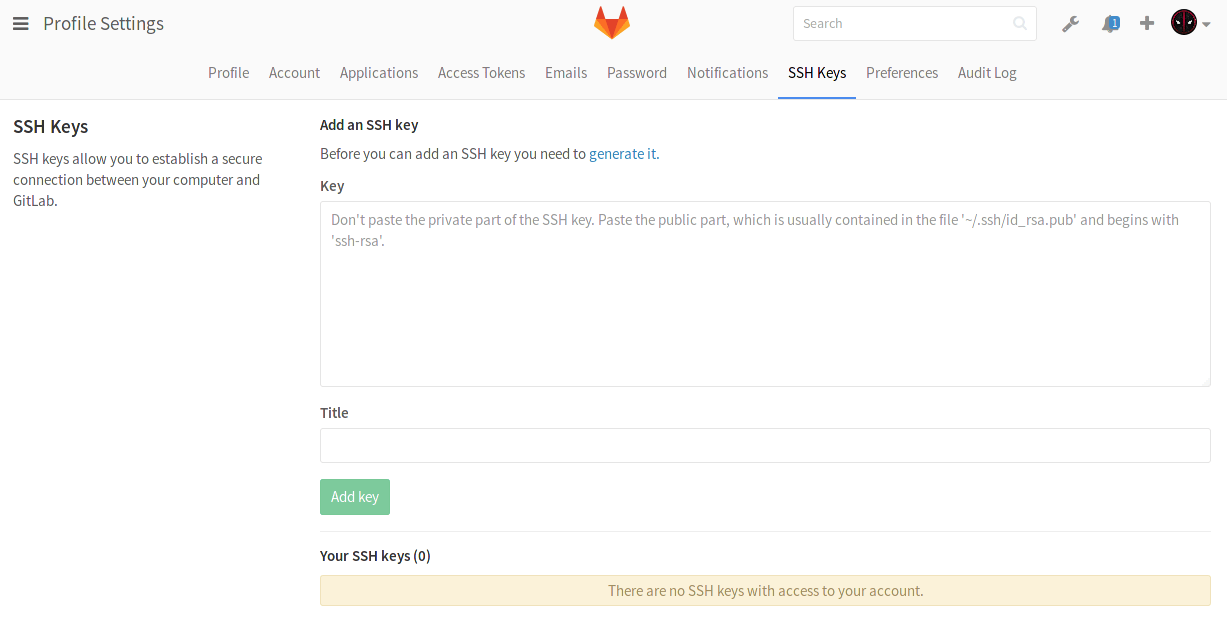 7. Finally, click on Add key to add it to GitLab. You will be able to see its fingerprint, its title and creation date.