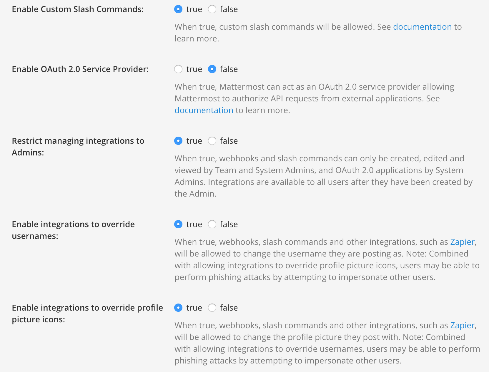 The first thing to do in Mattermost is to enable custom slash commands from the administrator console.